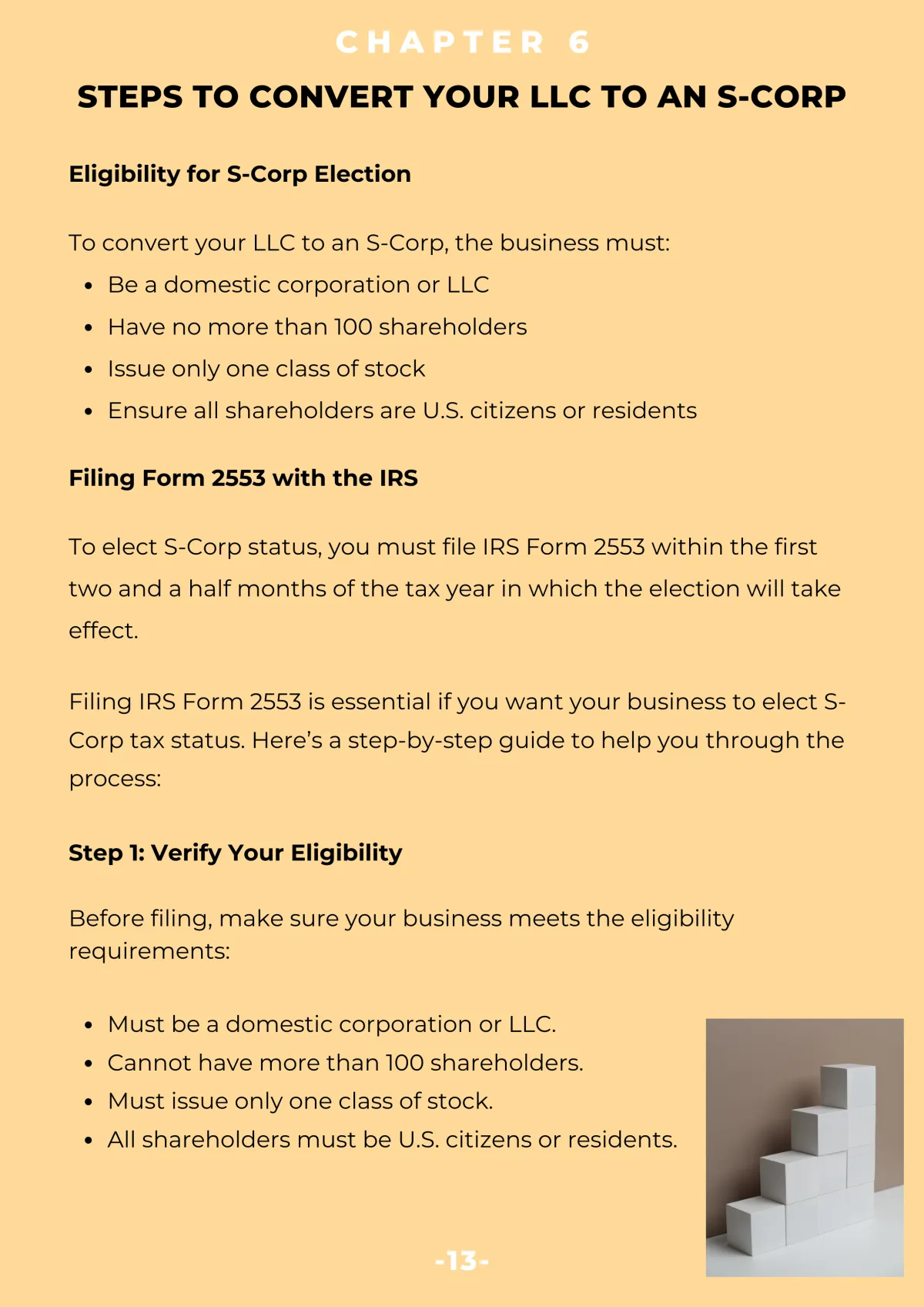 Learn the essential steps to transition your LLC to an S-Corp, including eligibility requirements and how to file IRS Form 2553. Maximize tax benefits and ensure compliance with this straightforward guide.